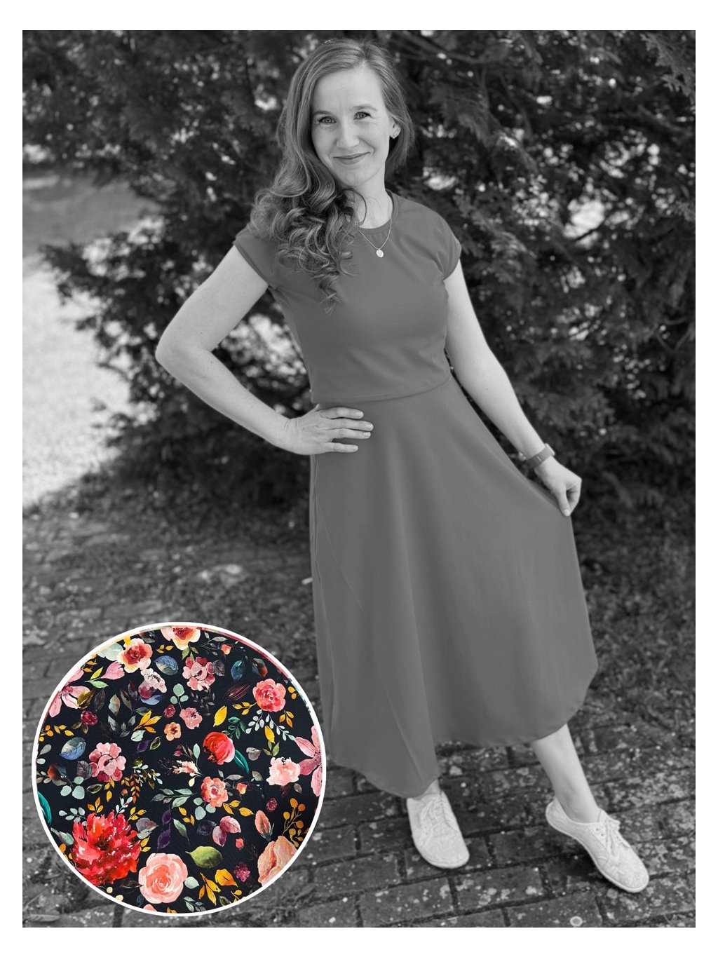 Na fotkách mám na sobě základní délku, velikost M a měřím 171 cm. Boky (v nejširší části) mám 104 cm.