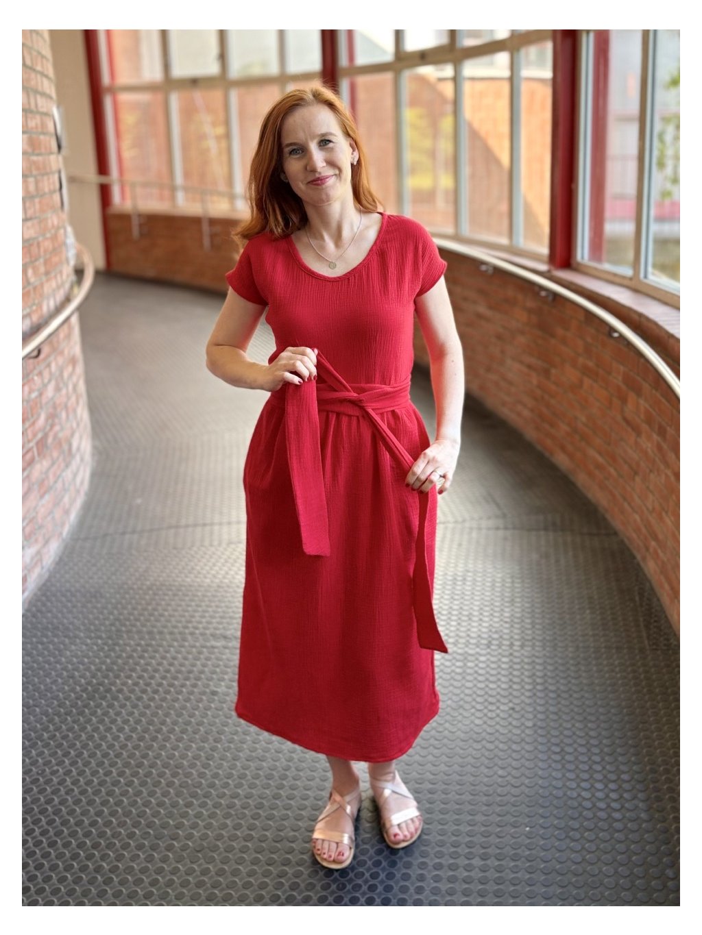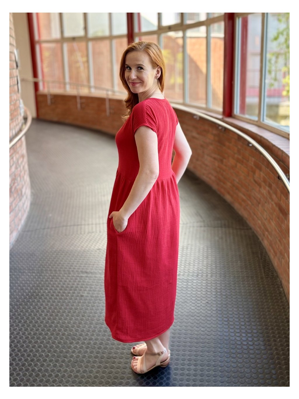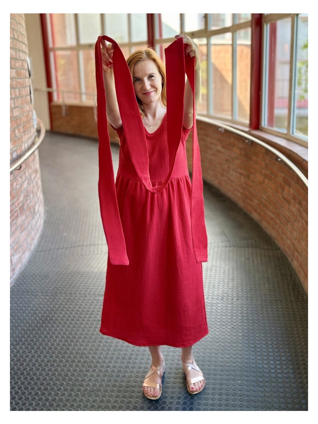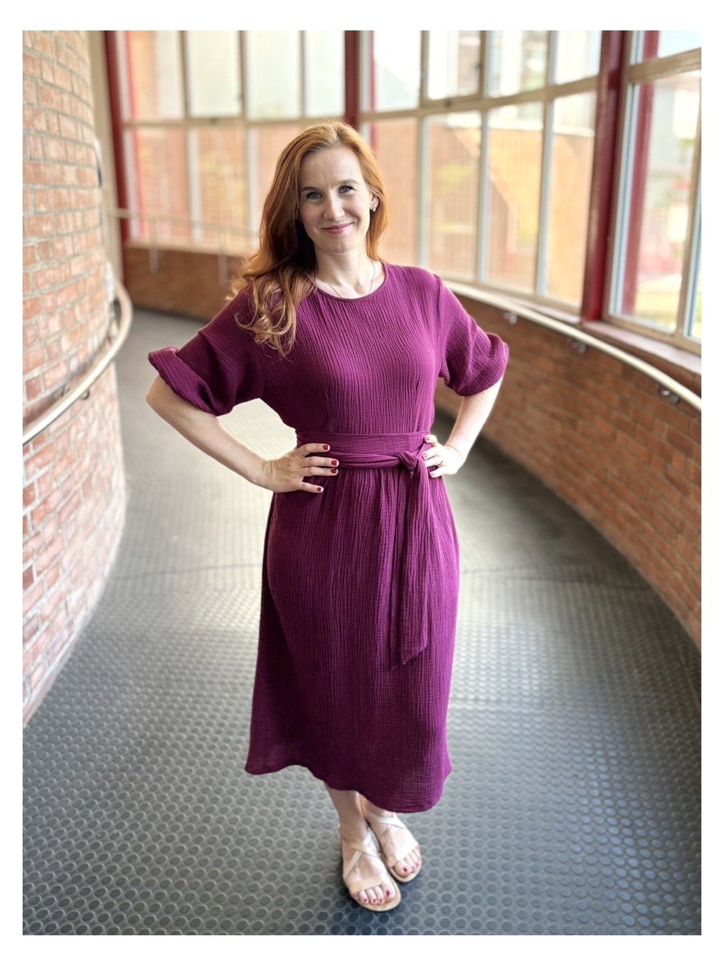 Vzdušné šaty Lara, šité z lehkého organického mušelínu s praktickými detaily, které vás nadchnou. Volný střih se záševky krásně splývá, široký pásek zvýrazní pas, pokud budete chtít, a volné podkasané rukávy dodávají modelu vzdušnost, stejně jako tato midi délka. A kapsy? Ty samozřejmě nechybí – protože styl a pohodlí jdou u nás ruku v ruce, stejně jako udržitelnost. ♡