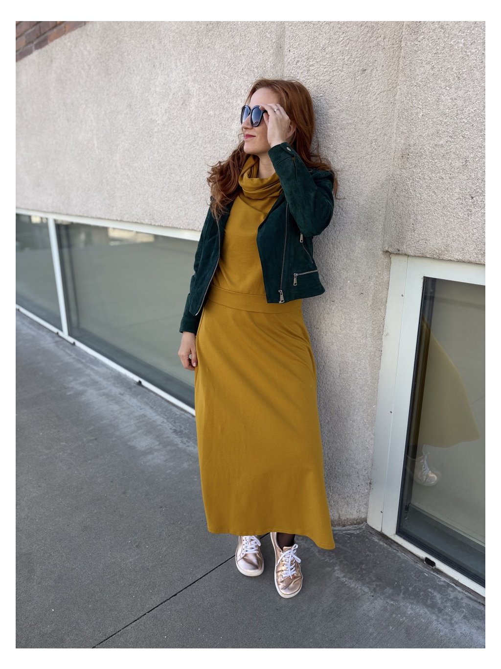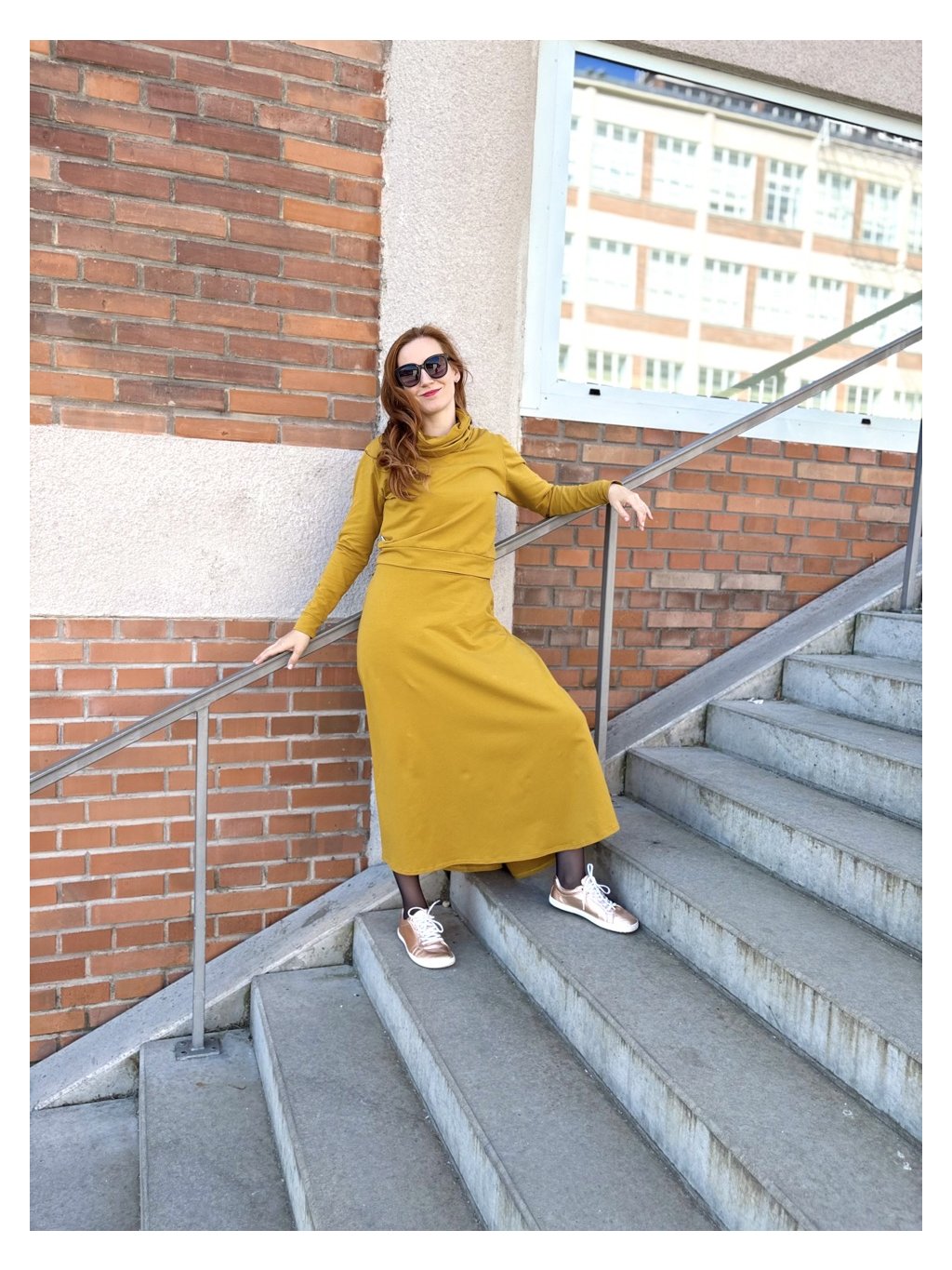 Na fotkách mám na sobě základní délku, velikost M a měřím 171 cm. Boky (v nejširší části) mám 104 cm.