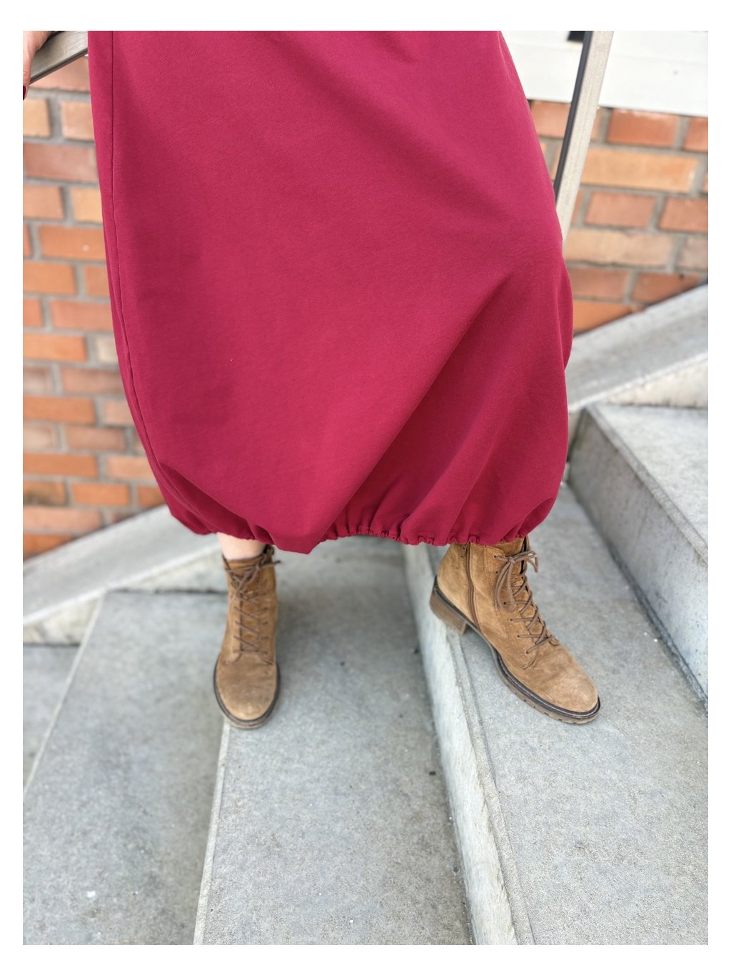 Na výběr jsou dvě varianty zakončení: volná rovná linie, nebo moderní verze s jemnou gumičkou, která dodá sukní městský charakter a originální tvar.