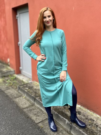 Šaty Bára jsou z teplákoviny s důmyslnými záševky a velkým rozparkem, ideální od podzimu do jara, když je na lehké šaty zkrátka zima.
