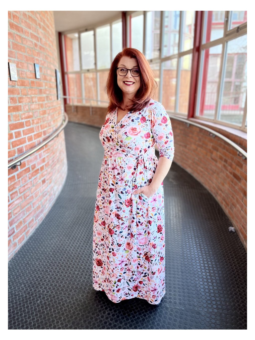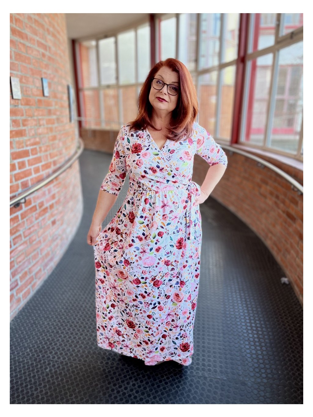 Na fotkách mám na sobě velikost M, obvod pasu mám 77 cm a boky (v nejširší části) 104 cm. Modelka v bílých akvarelových šatech má velikost XL.